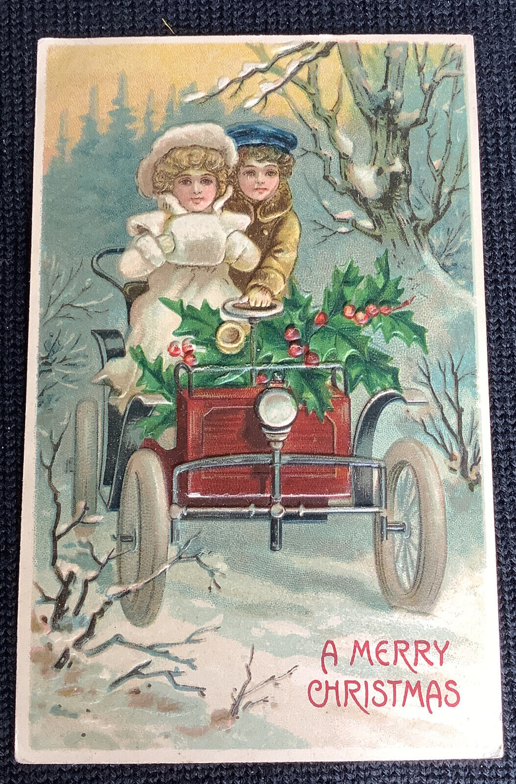 vintage Embossed Christmas Postcard couple in Antique Car printed Germany BW 296