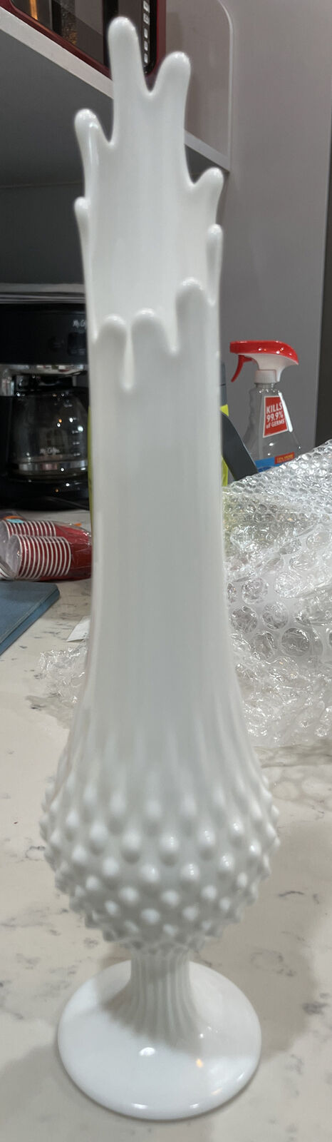 Title (ebay affiliate link): Vintage 1950 Fenton Milk Glass Hobnail Vase White Swung Pedestal Stretch 15in
