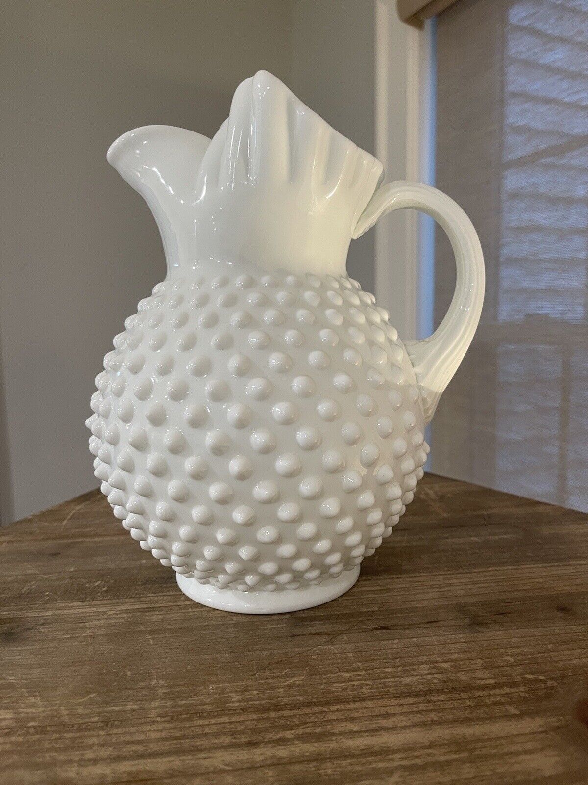 Title (ebay affiliate link): Beautiful Vintage Fenton Milk Glass Hobnail Ice Lip Pitcher 2 qt.