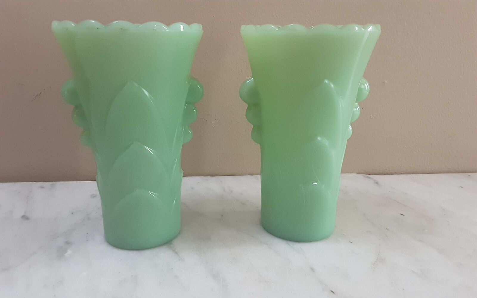 2 Vtg Fire King Anchor Hocking Jadeite Milk Glass Vases