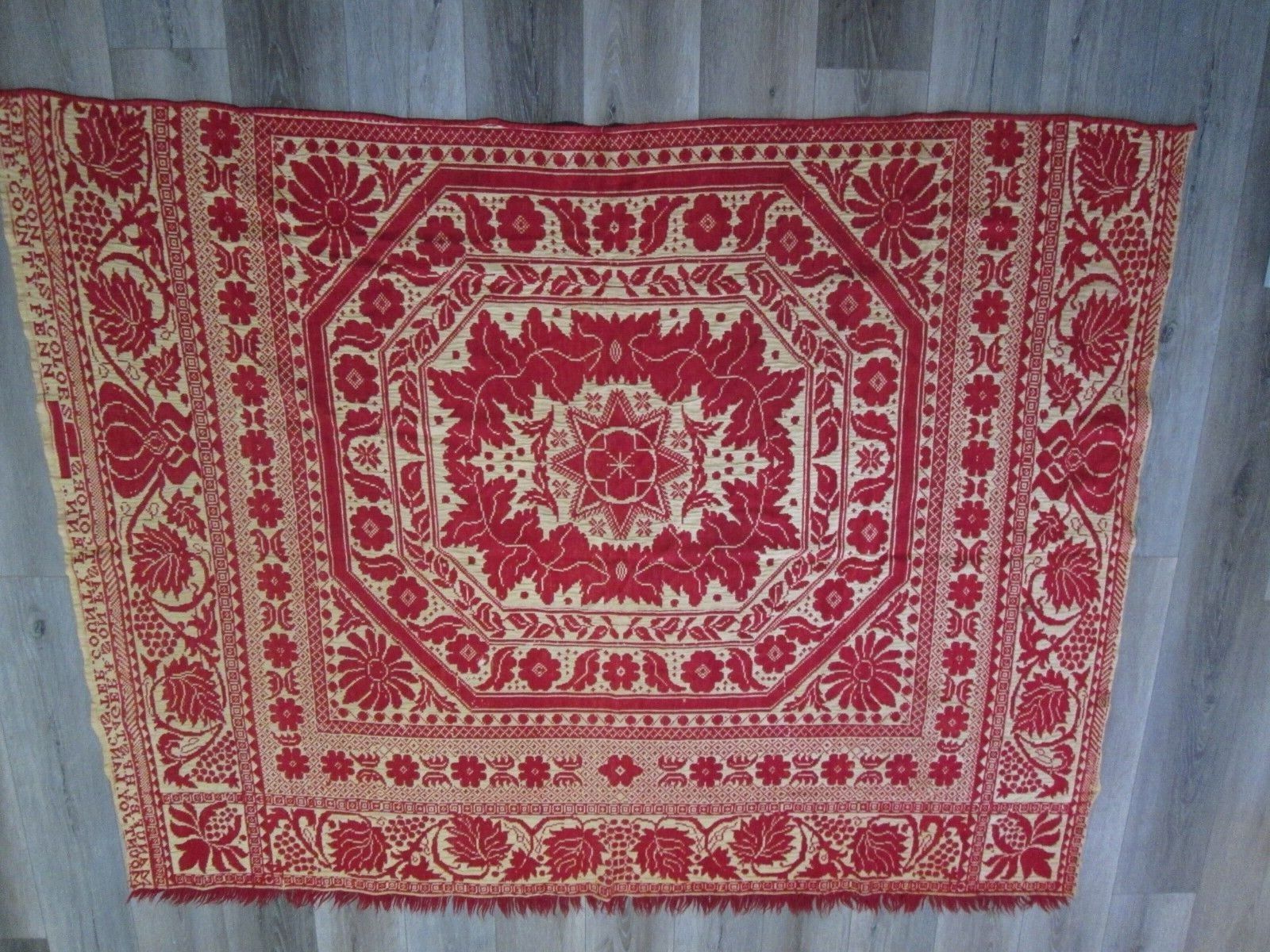 Title (ebay affiliate link): ANTIQUE EARLY AMERICAN RED WHITE COVERLET WITH FRINGE 7434 X 5934