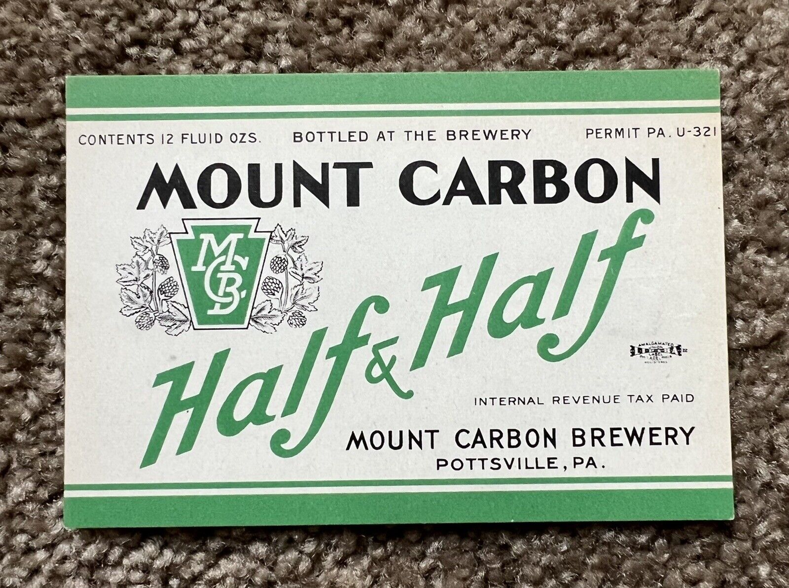 Title (ebay affiliate link): IRTP U 12oz Mt Carbon Half Half Beer Label Mt Carbon Brewery PottsvillePA
