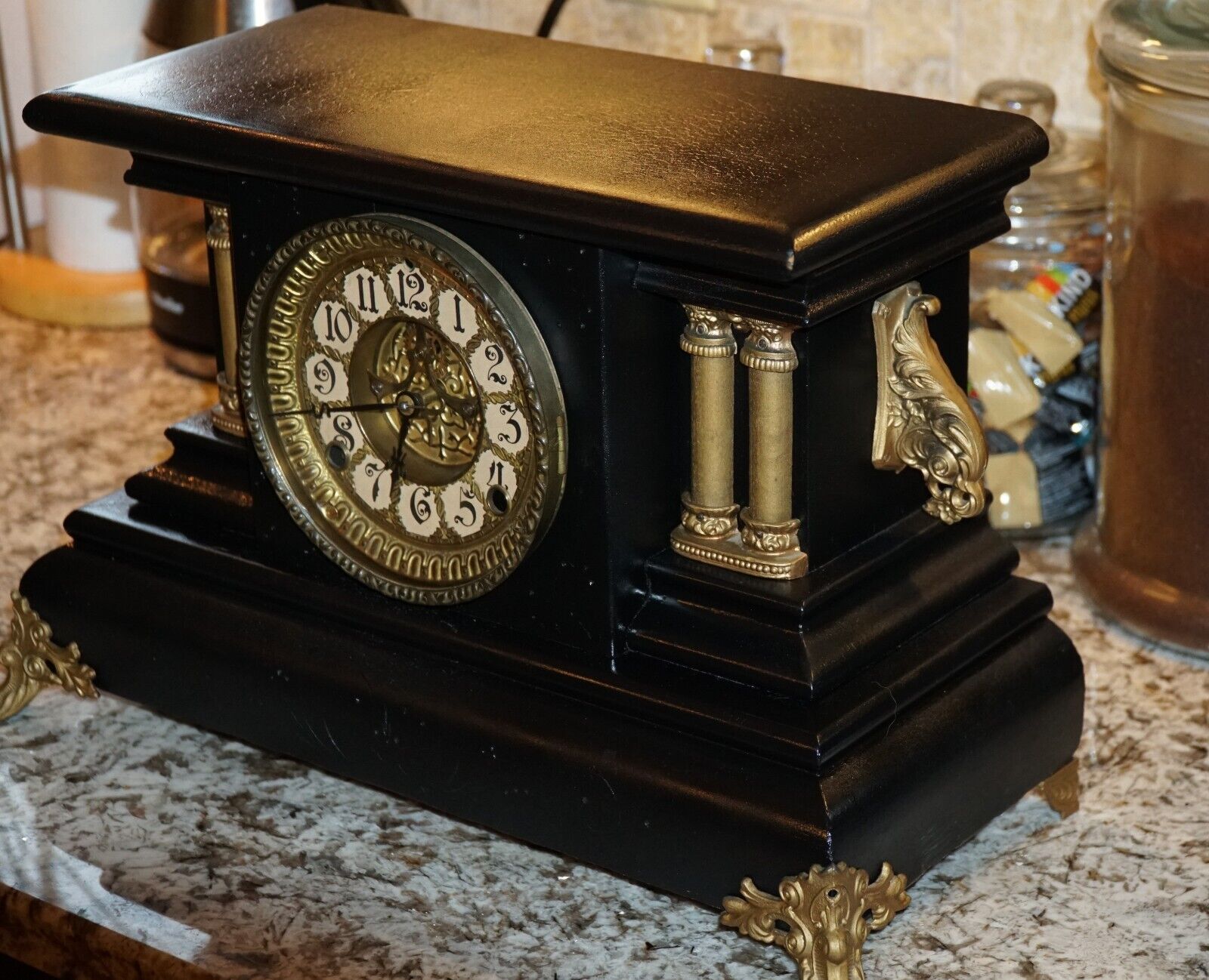 Title (ebay affiliate link): Antique Gilbert Black Mantle Clock Beautiful Open Escapement Runs And Chimes