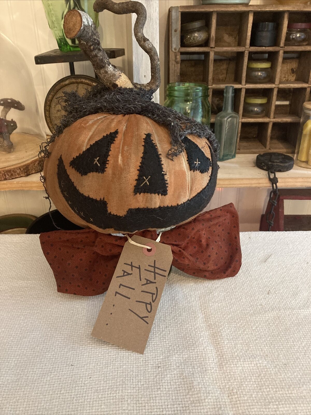 Primitive FAll Halloween PUmpkin pewter Make do makedo Doll shelf sitter