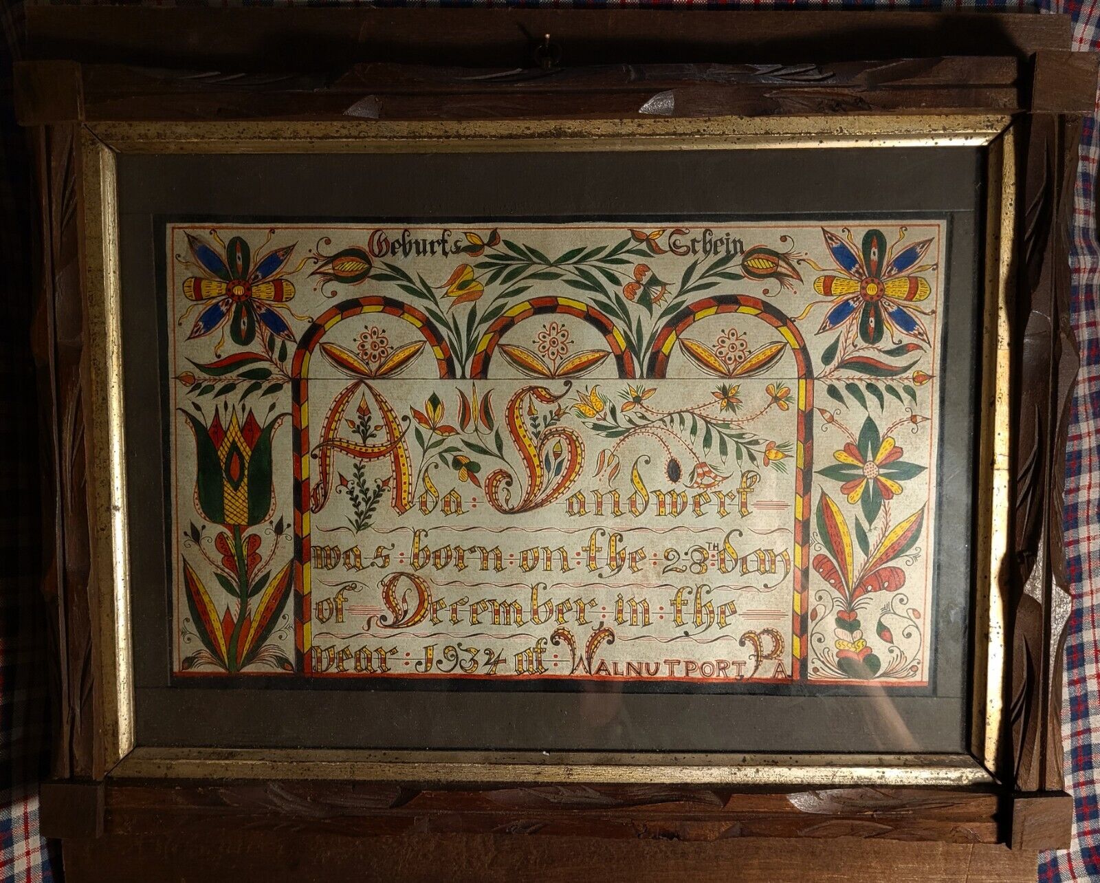Title (ebay affiliate link): A Superb Vintage Hand Done Fraktur Birth Certificate original Walnut Frame