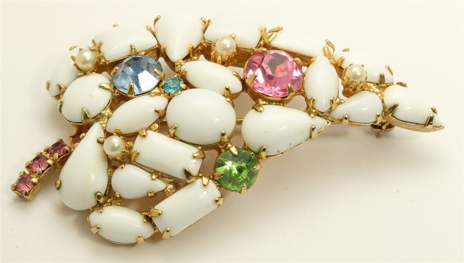 Vintage DE Juliana Milk Glass Crystal Rhinestone Floral Leaf Brooch Pin