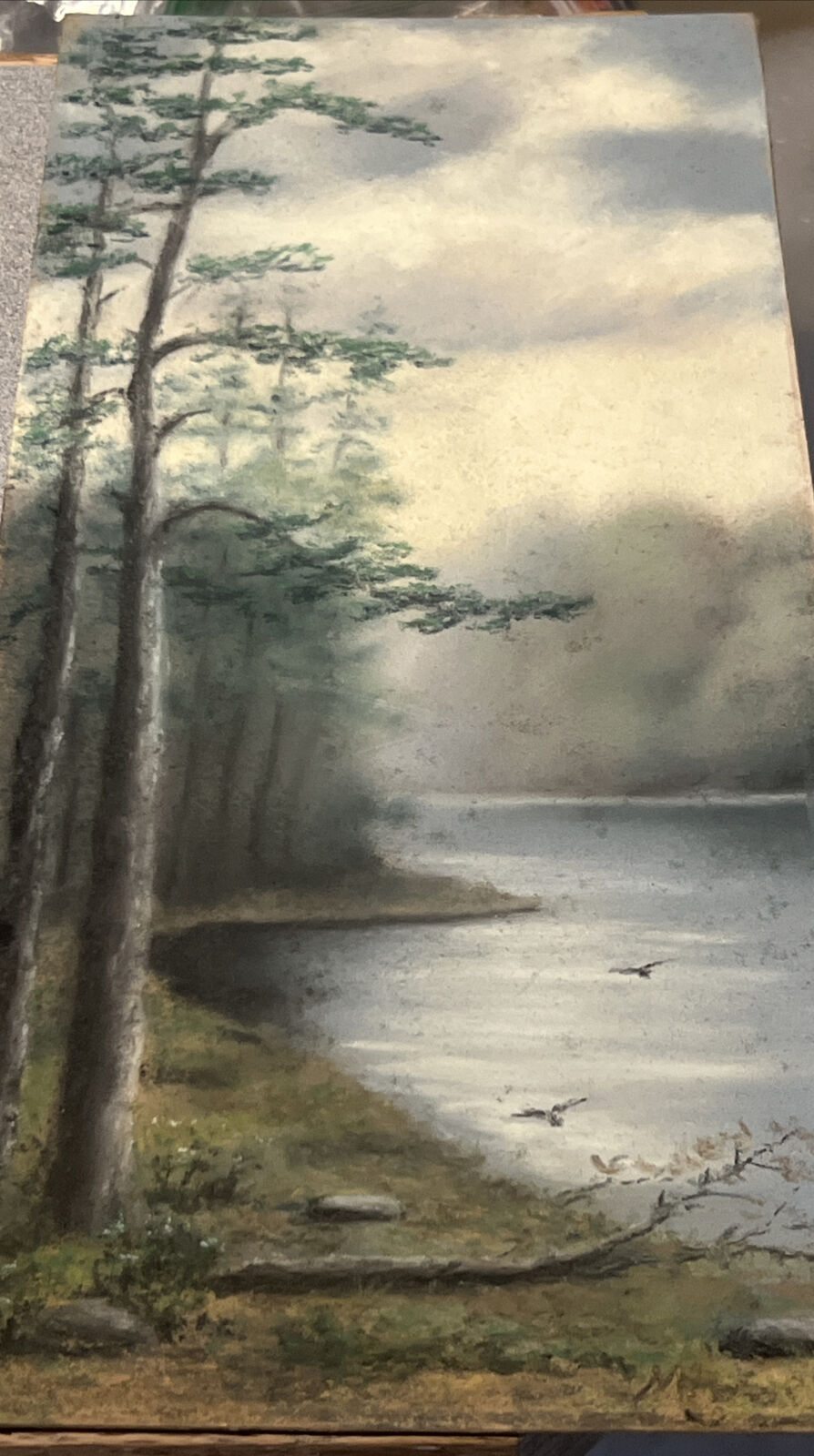 ANTIQUE estate PASTEL PAINTING lake woods signed