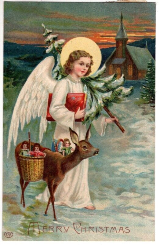 Title (ebay affiliate link): ANTIQUE EMBOSSED CHRISTMAS Postcard ANGEL CARRYNG TREE WALKING WITH DEER