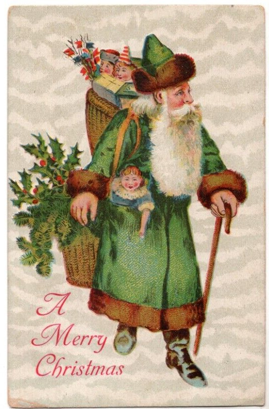 Title (ebay affiliate link): ANTIQUE EMBOSSED CHRISTMAS Postcard SANTA CLAUS FURTRIMMED GREEN COAT HAT