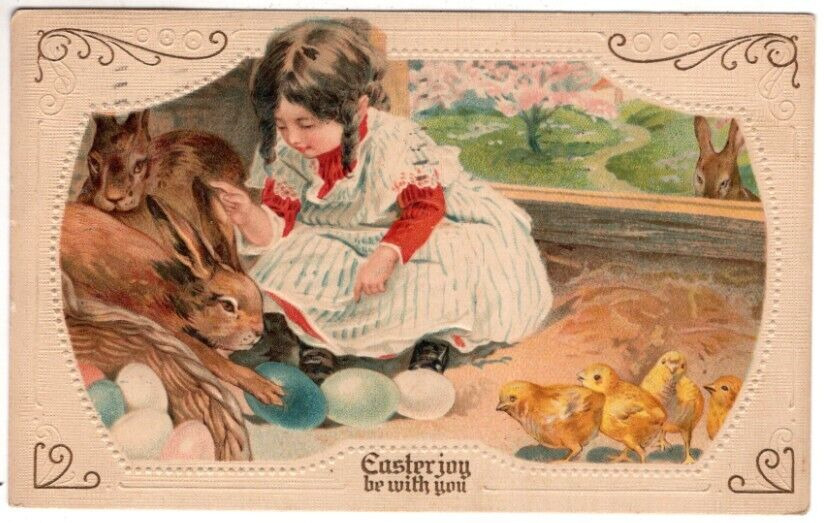 Title (ebay affiliate link): ANTIQUE EMBOSSED EASTER Postcard YOUNG GIRL BUNNIES CHICKS BASKET OF EGGS
