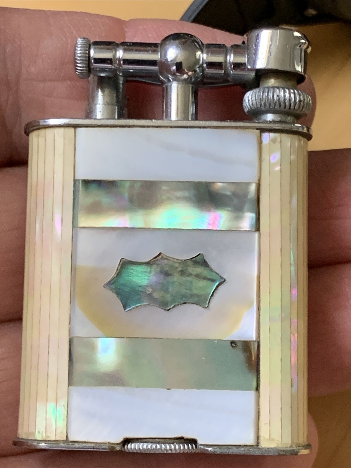 Title (ebay affiliate link): Vintage Lift Arm Pocket Lighter Nice Mother Of Pearl Design MIOJ Occupied Japan