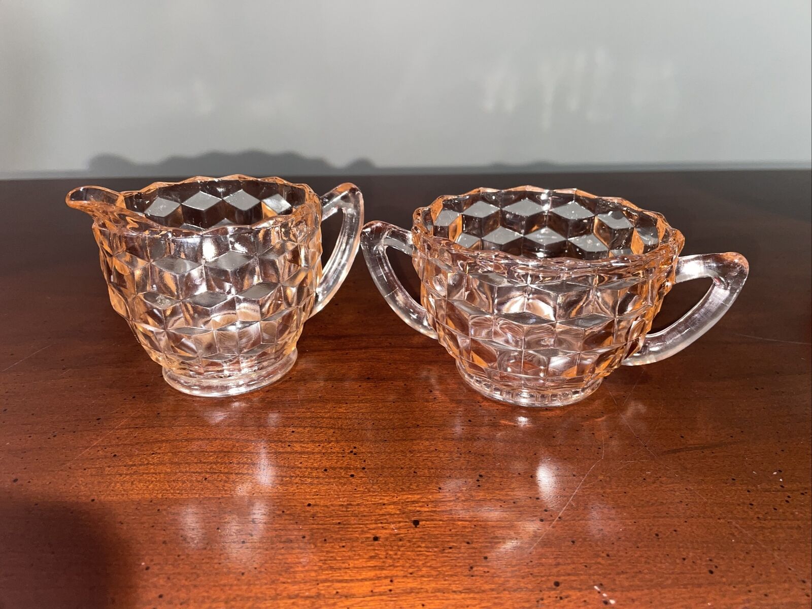 Title (ebay affiliate link): Vintage Pink Depression Glass Creamer and Sugar Bowl Cube Cubist