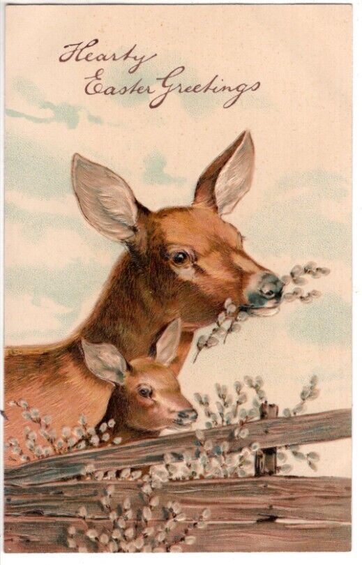 Title (ebay affiliate link): ANTIQUE EMBOSSED EASTER Postcard PFB DOE AND FAWN PUSSYWILLOWS