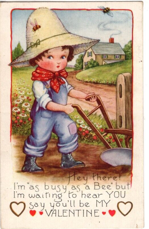 Title (ebay affiliate link): ANTIQUE VALENTINE Postcard WHITNEY MADE BEES BUZZING AROUND BOY GARDEN