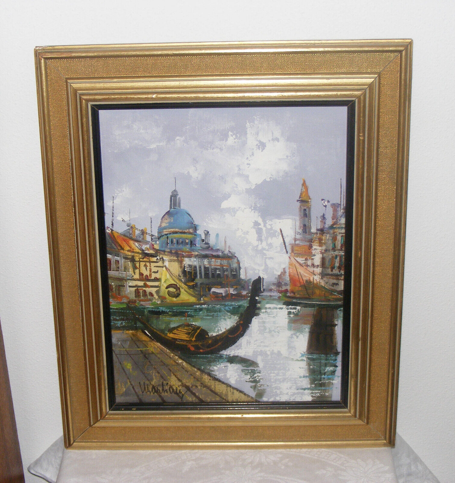 Vintage Original Oil Painting Signed Wood Frame Venice Skyline Waterway Gondola