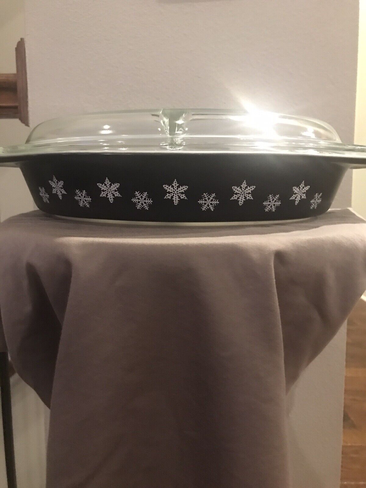 Title (ebay affiliate link): Vintage PYREX Black Snowflake Divided 1.5 Quart Casserole Baking Dish Inc. Lid