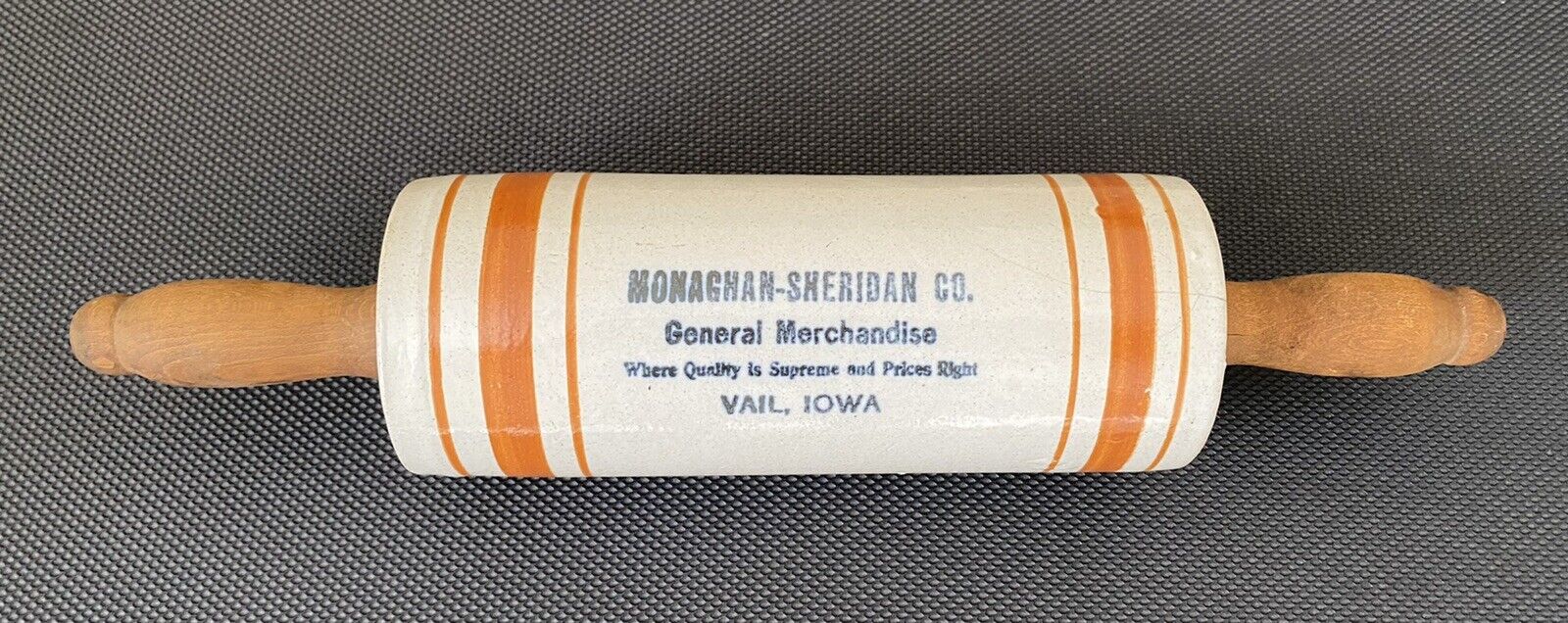Title (ebay affiliate link): Antique Stoneware Rolling Pin MonaghanSheridan General Merchandise Vail Iowa