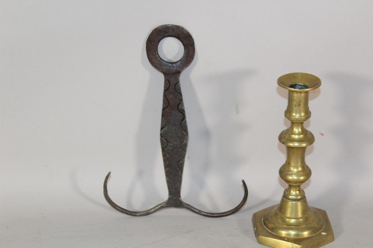 RARE 17TH C PILGRIM PERIOD WROUGHT IRON DECORATED SKEWER HOLDER IN OLD SURFACE