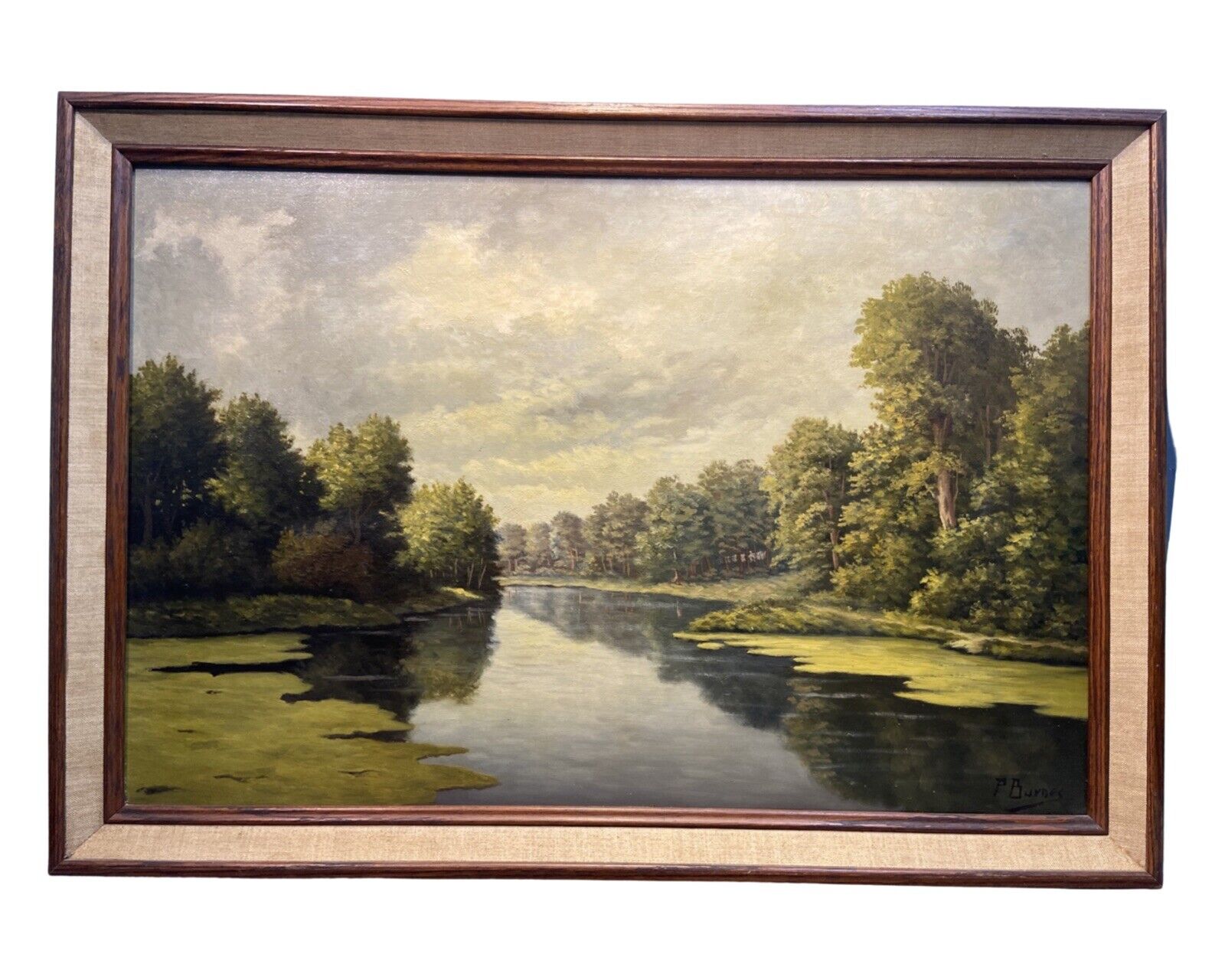 Title (ebay affiliate link): LG Vintage MID CENTURY Old RIVERSCAPE River Trees LANDSCAPE P. Burnes PAINTING