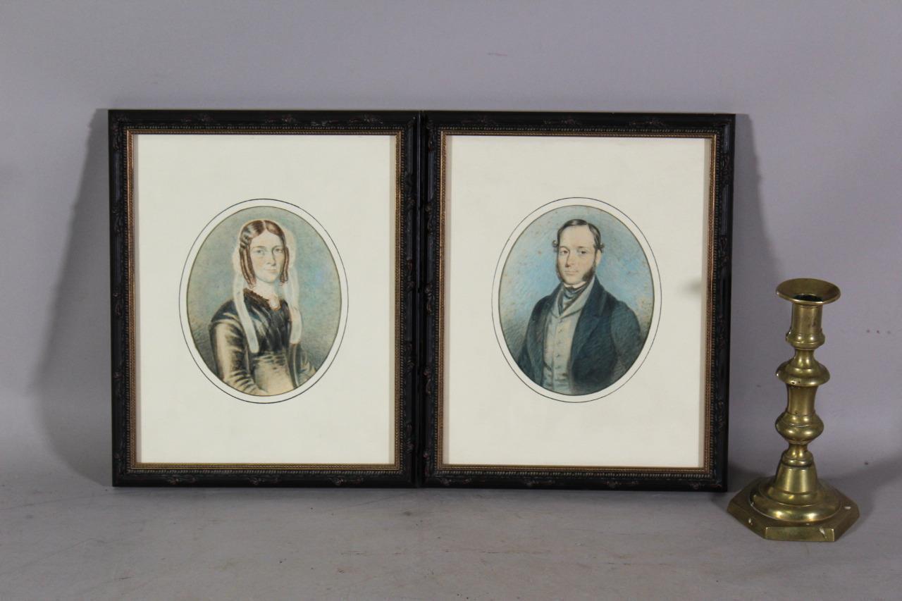 RARE PAIR MINIATURE 19TH C WATERCOLOR PORTRAITS OF A MAN WOMAN GREAT DETAILS
