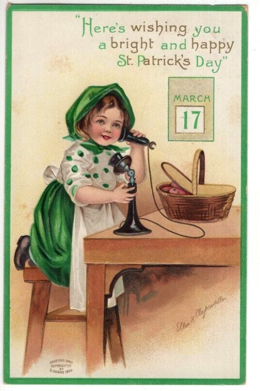 Title (ebay affiliate link): ANTIQUE ST. PATRICKS DAY Postcard ELLEN CLAPSADDLE YOUNG GIRL ON PHONE