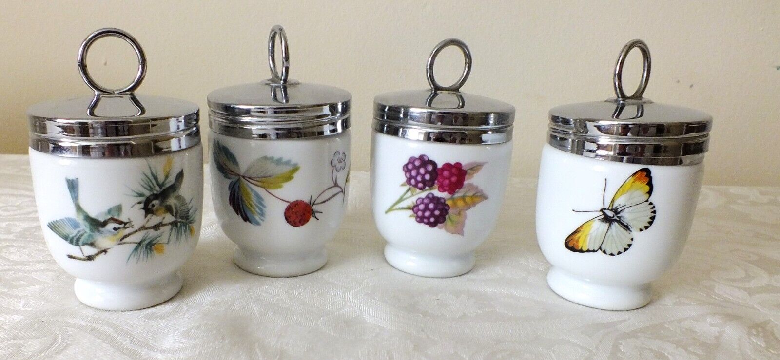 Title (ebay affiliate link): Lot of 4 Royal Worcester Egg Coddlers Birds Butterflies Fruits with lids