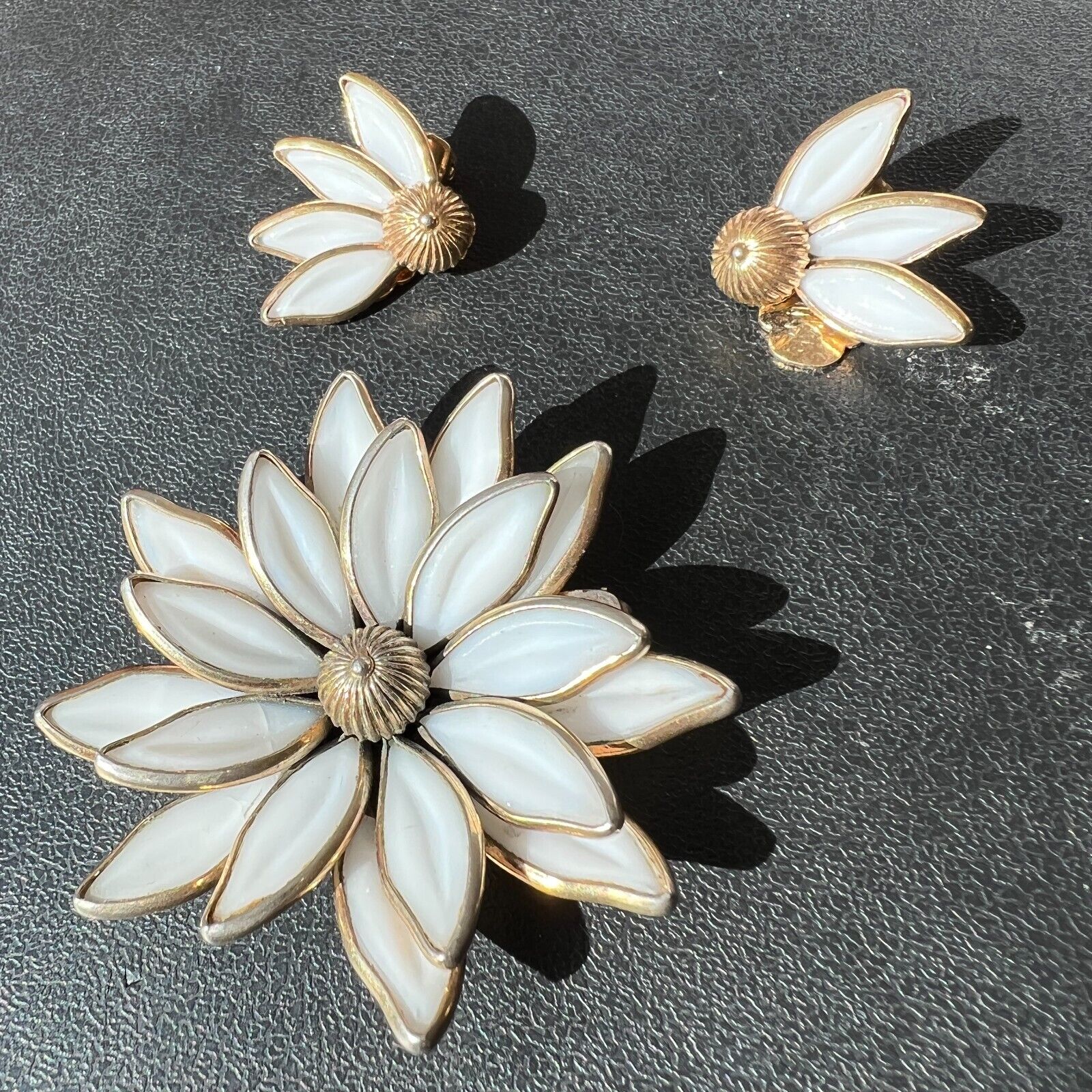 Title (ebay affiliate link): A476 Signed CROWN TRIFARI Vintage White Milk Glass Flower Brooch Pin Earring SET
