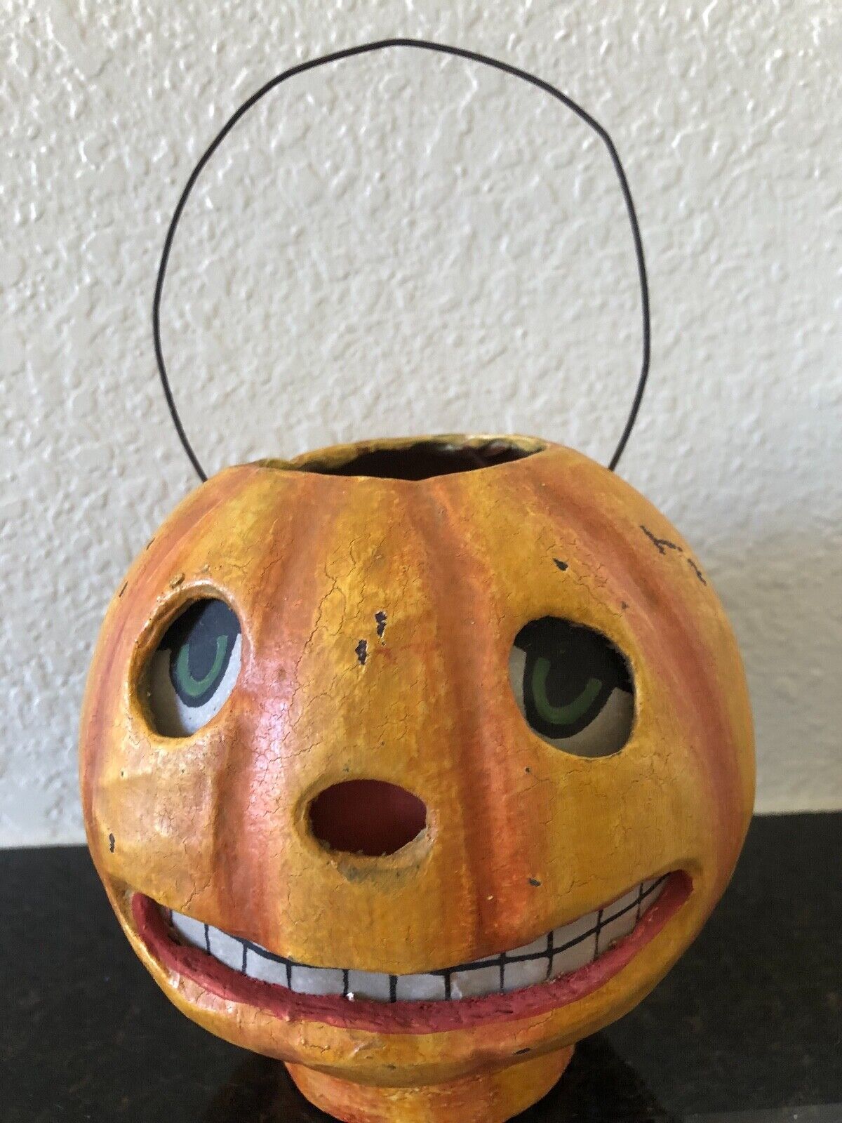 Title (ebay affiliate link): BETHANY LOWE HALLOWEEN PAPER MACHE JACKOLANTERN PUMPKIN BUCKET VTG STYLE