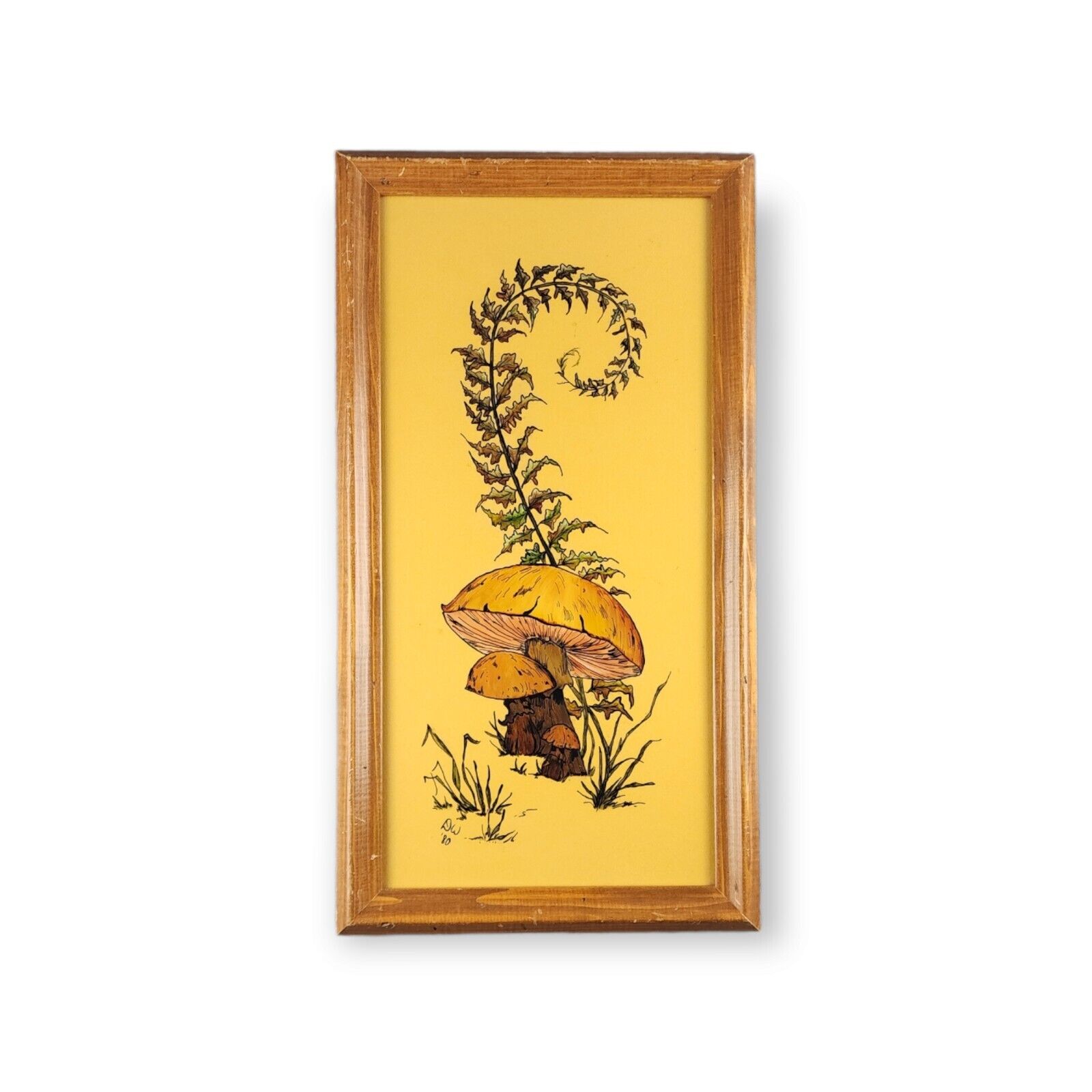 Original Mushroom Fern Artwork 17.534 x 9.534 Framed Art Vintage 1980 Signed DW