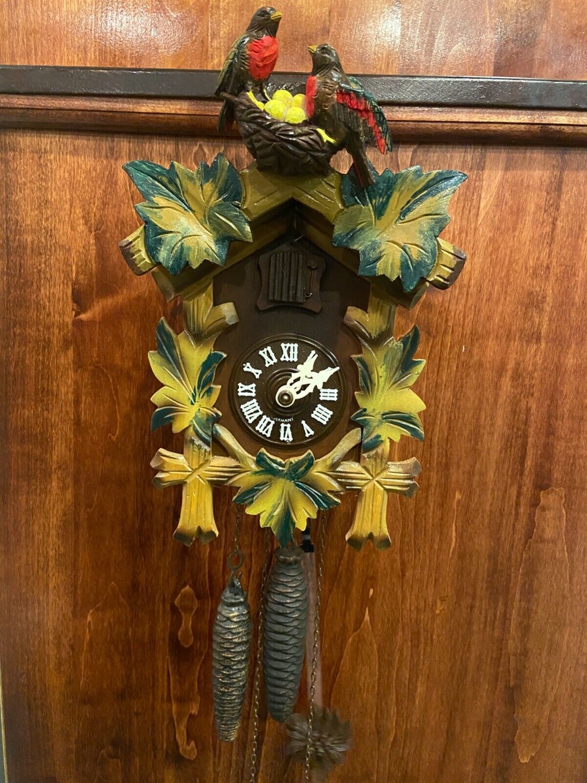 Title (ebay affiliate link): Vintage Authentic German Cuckoo Clock with Nesting Bird /Maple Leaf Topper
