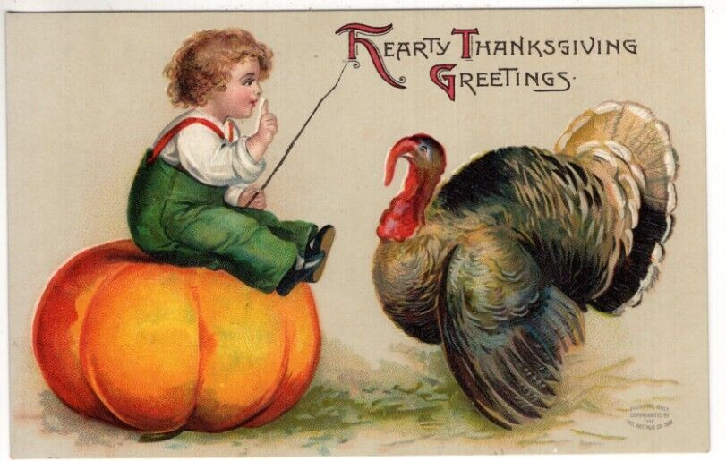 ANTIQUE EMBOSSED THANKSGIVING Postcard YOUNG BOY SITTING ON PUMPKIN TURKEY