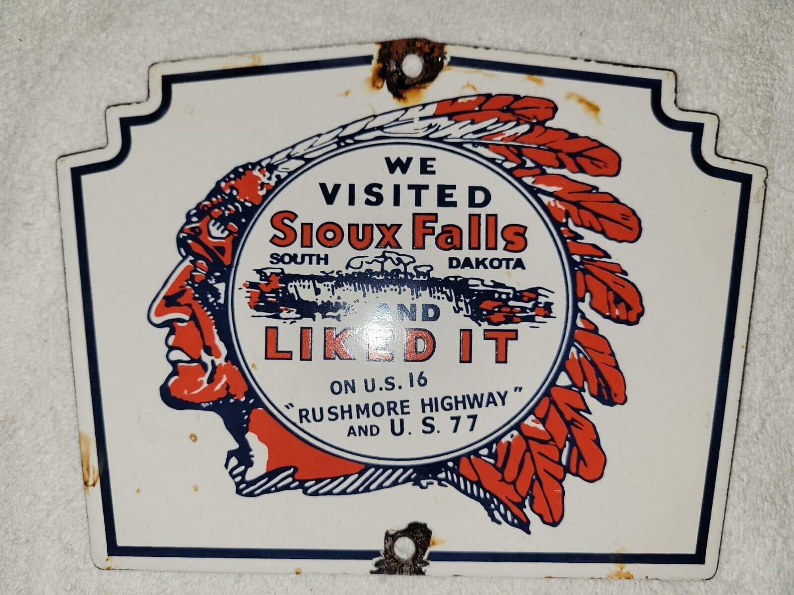 Title (ebay affiliate link): Vintage Sioux Falls Porcelain Sign South Dakota Mt. Rushmore Hwy US Indian Chief