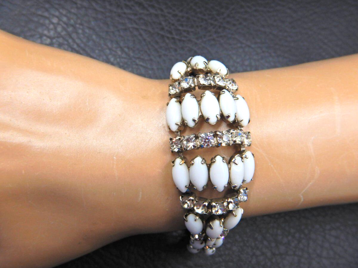 Title (ebay affiliate link): Vintage Bracelet High End White Milk Glass Cabochons Arched Rhinestone Center