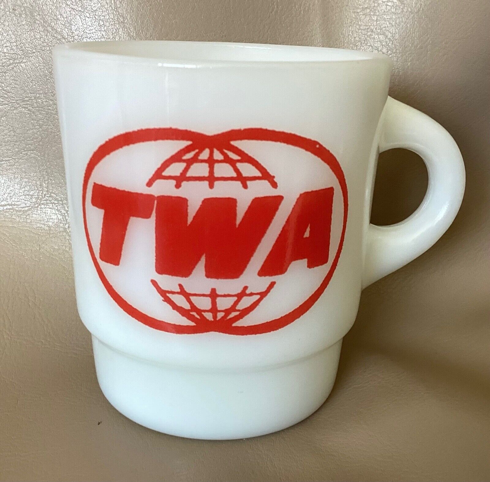 Fire King TWA Trans World Airlines Milk Glass Stacking Coffee Mug