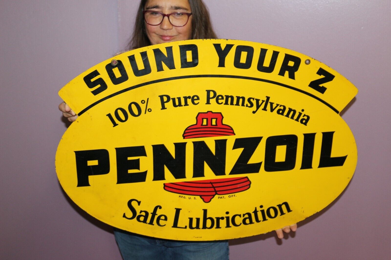 Vintage 1959 Pennzoil Sound Your Z Motor Oil Gas Station 2 Sided 3134 Metal Sign
