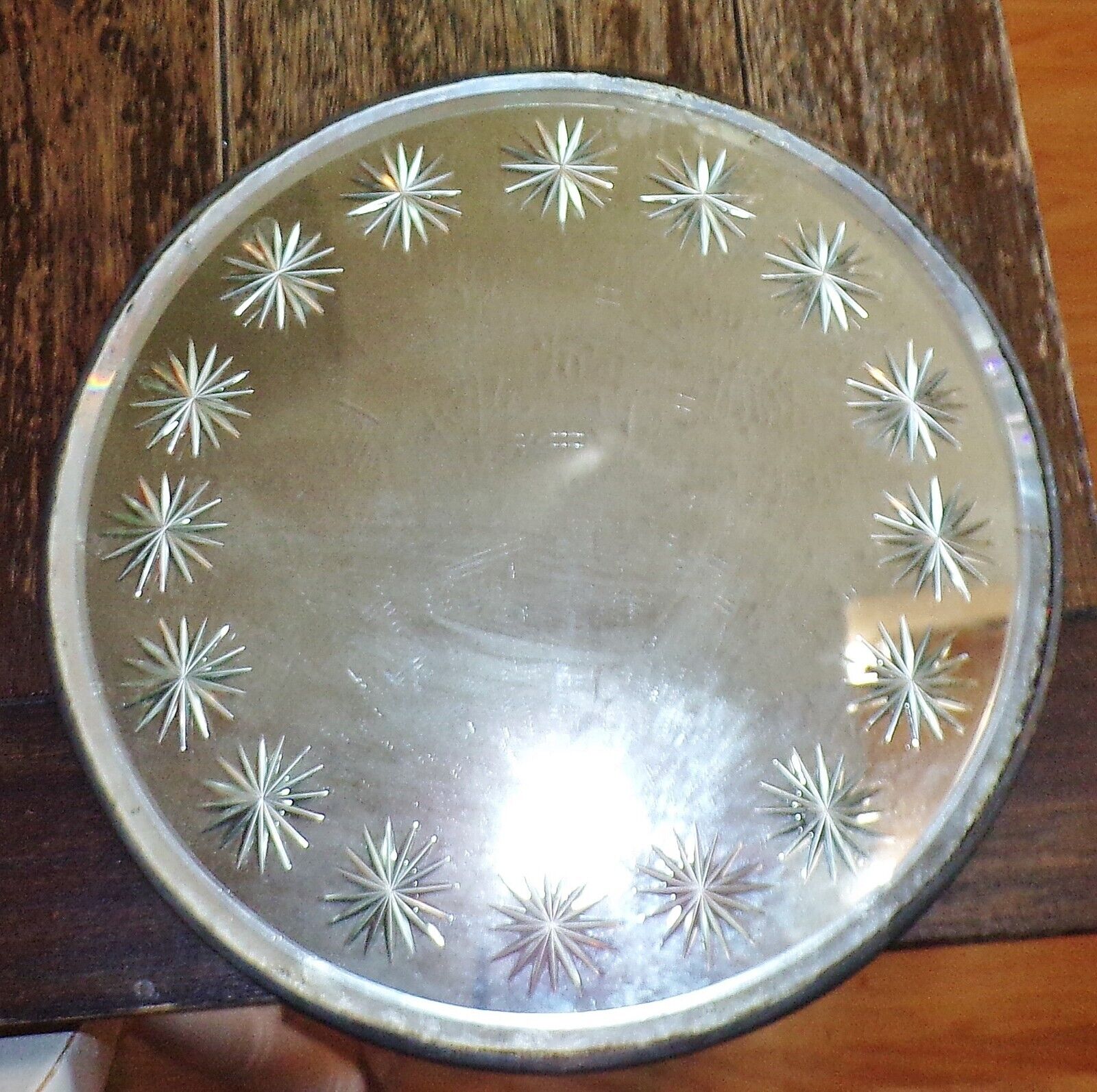 Title (ebay affiliate link): Antique Round Mirror Beveled Edge Snowflake/flower type design on glass