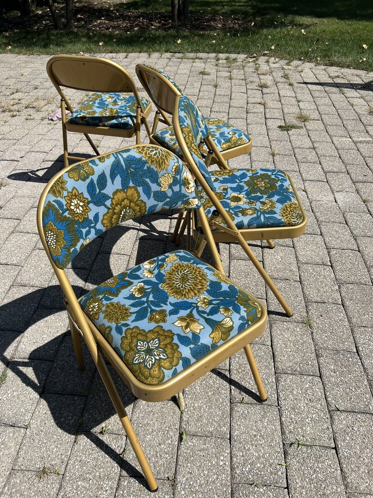 Title (ebay affiliate link): 4 Vintage Mid Century Modern Metal Cushioned Folding Bronze Gold Chairs