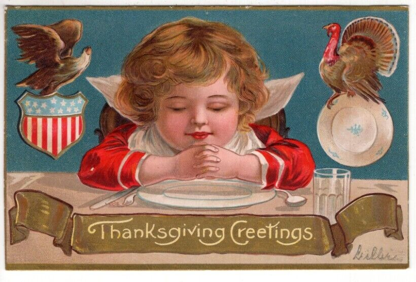 ANTIQUE EMBOSSED THANKSGIVING Postcard CHILD AT TABLE PRAYING EAGLE TURKEY