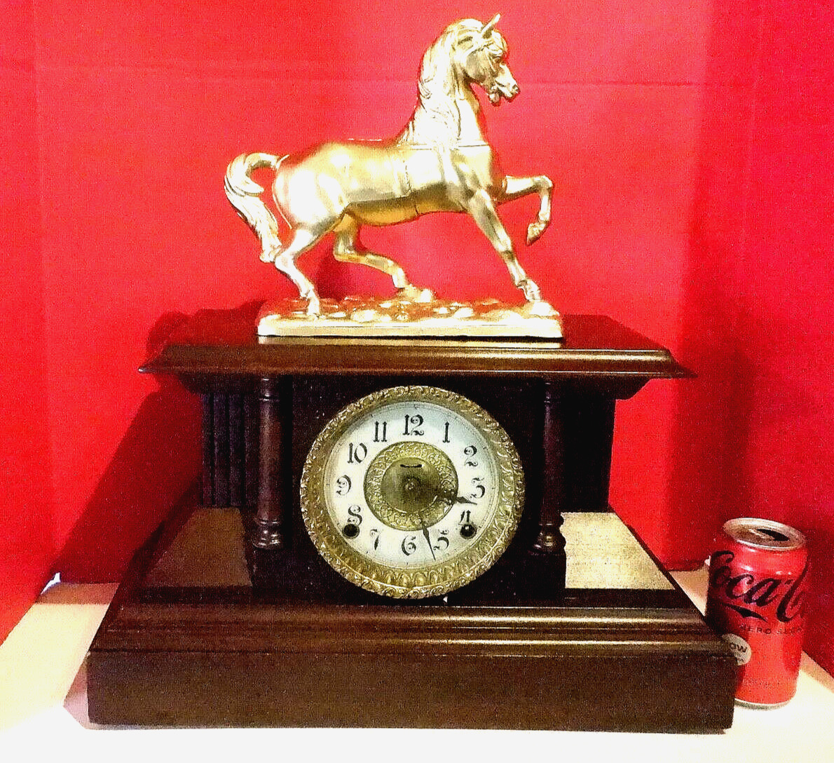 Title (ebay affiliate link): Antique Ingraham 8 Day Time Strike Walnut Mantle Clock w/Horse Topper