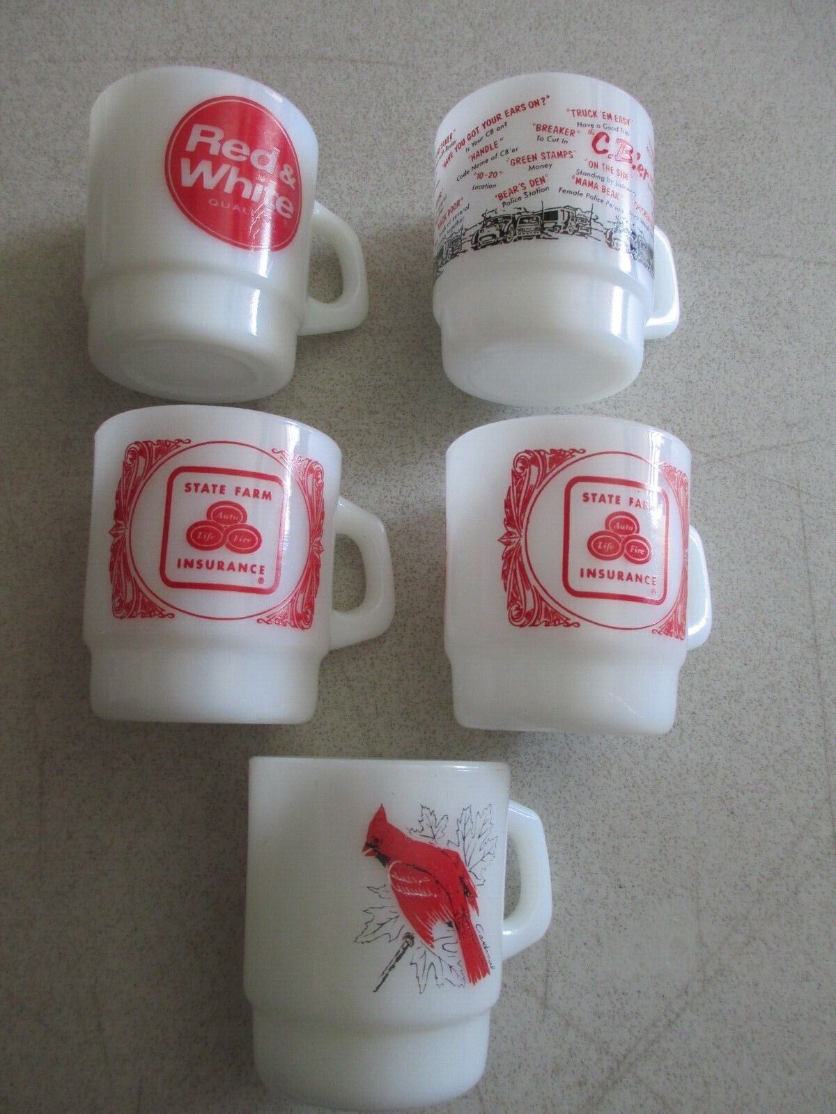 Title (ebay affiliate link): Lot Vintage Anchor Hocking Fire King Stack Mugs Advertisement Bird Red White