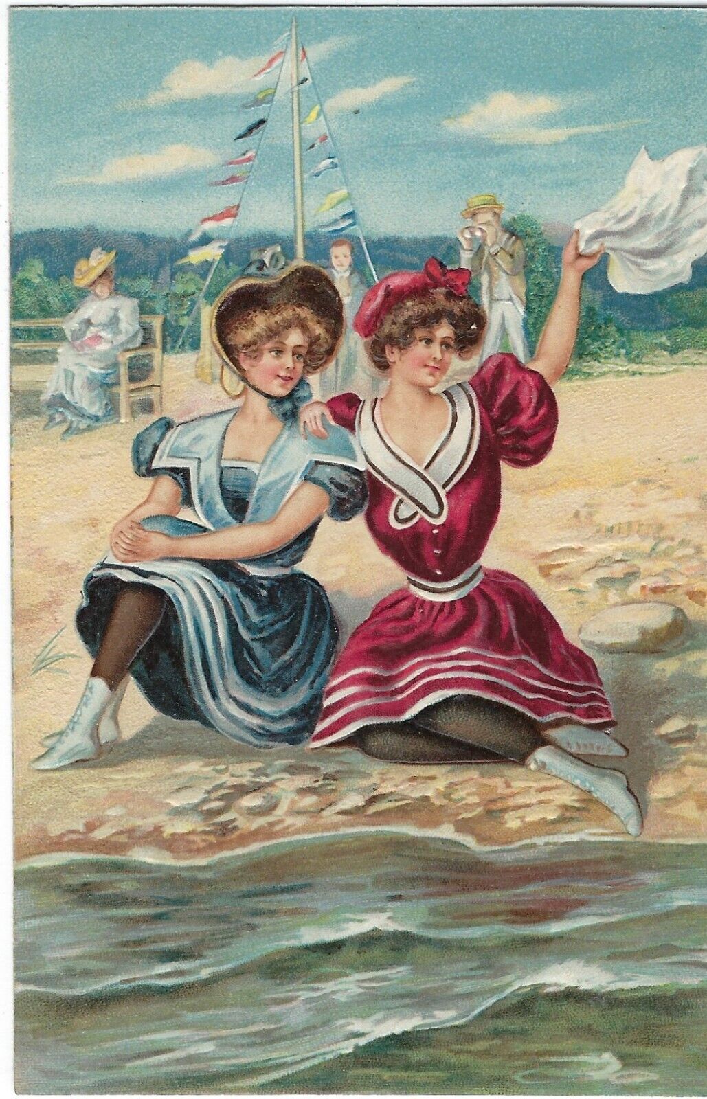 Antique Victorian Lady Postcard Ladies Sitting On Beach Embossed