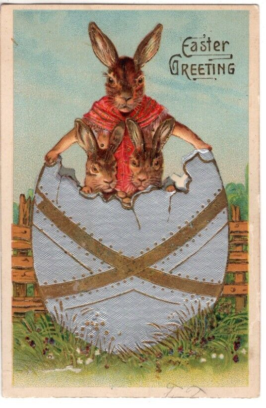 Title (ebay affiliate link): ANTIQUE EMBOSSED EASTER Postcard MAMA BUNNY SHAWL BABY BUNNIES EGG