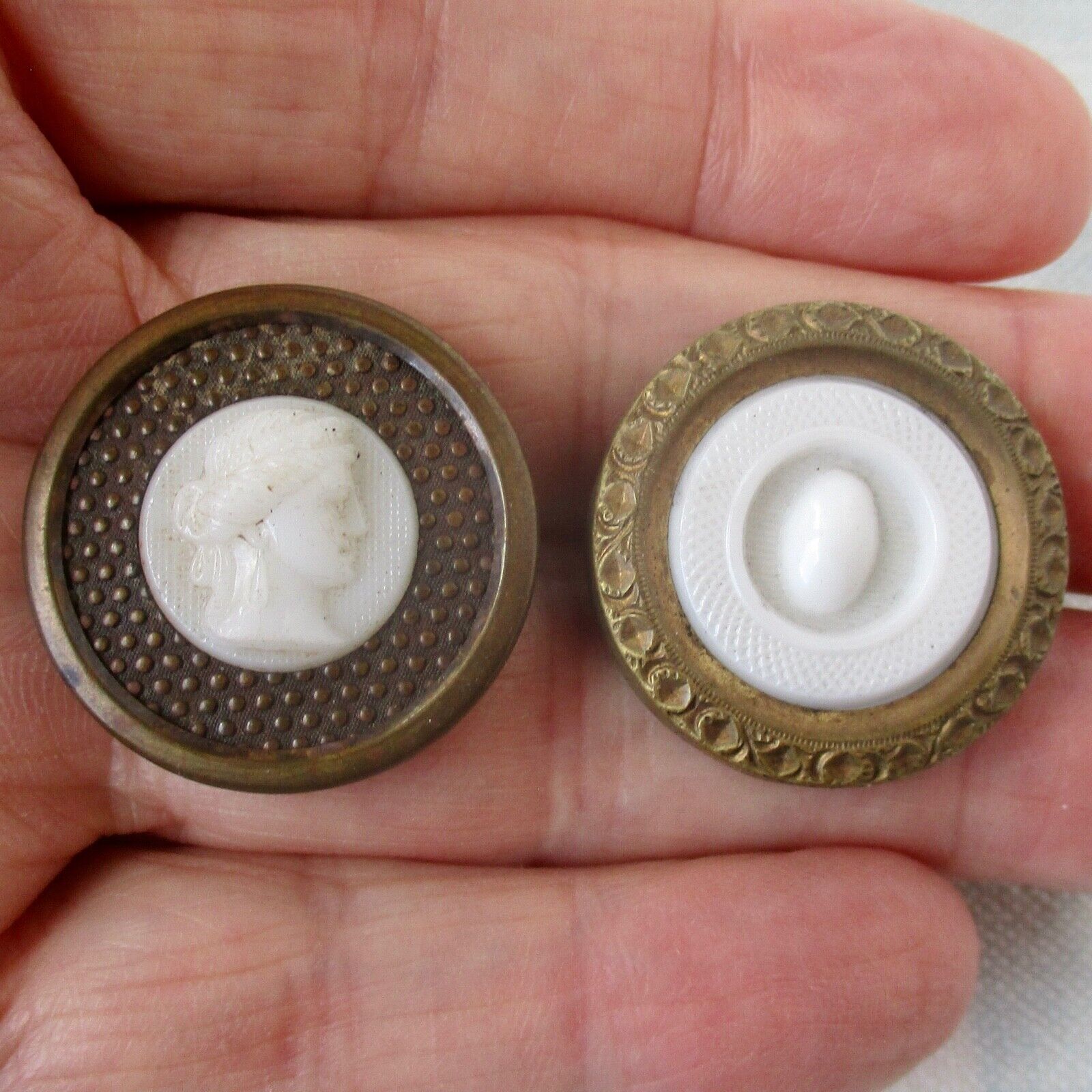 Title (ebay affiliate link): 2 Antique Molded Milk Glass Set on Brass Buttons 1 w Pad Shank