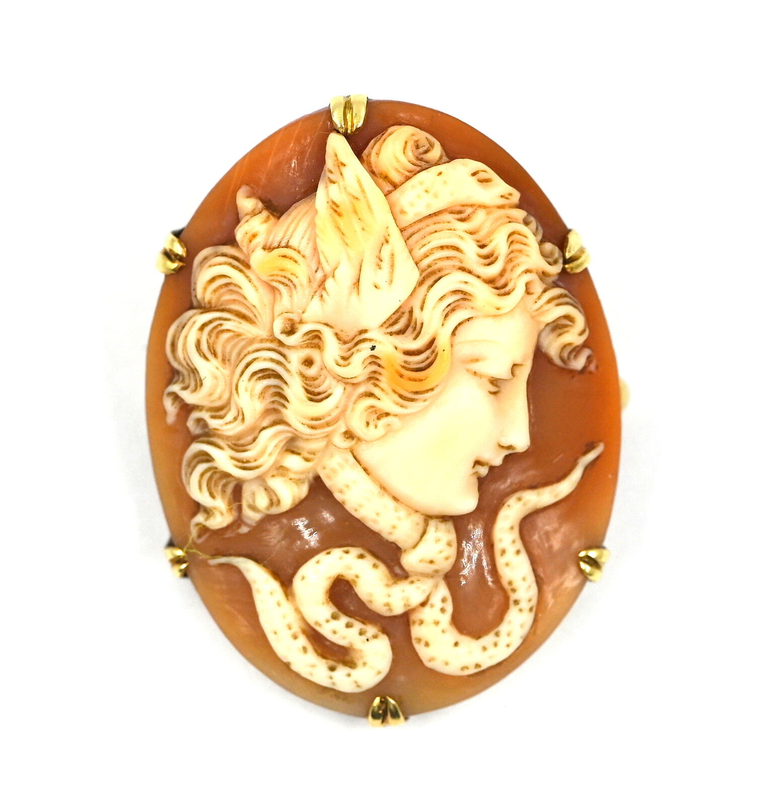 Title (ebay affiliate link): ANTIQUE VICTORIAN CARVED SHELL MEDUSA SNAKE CAMEO GREEK MYTH 14K YELLOW GOLD