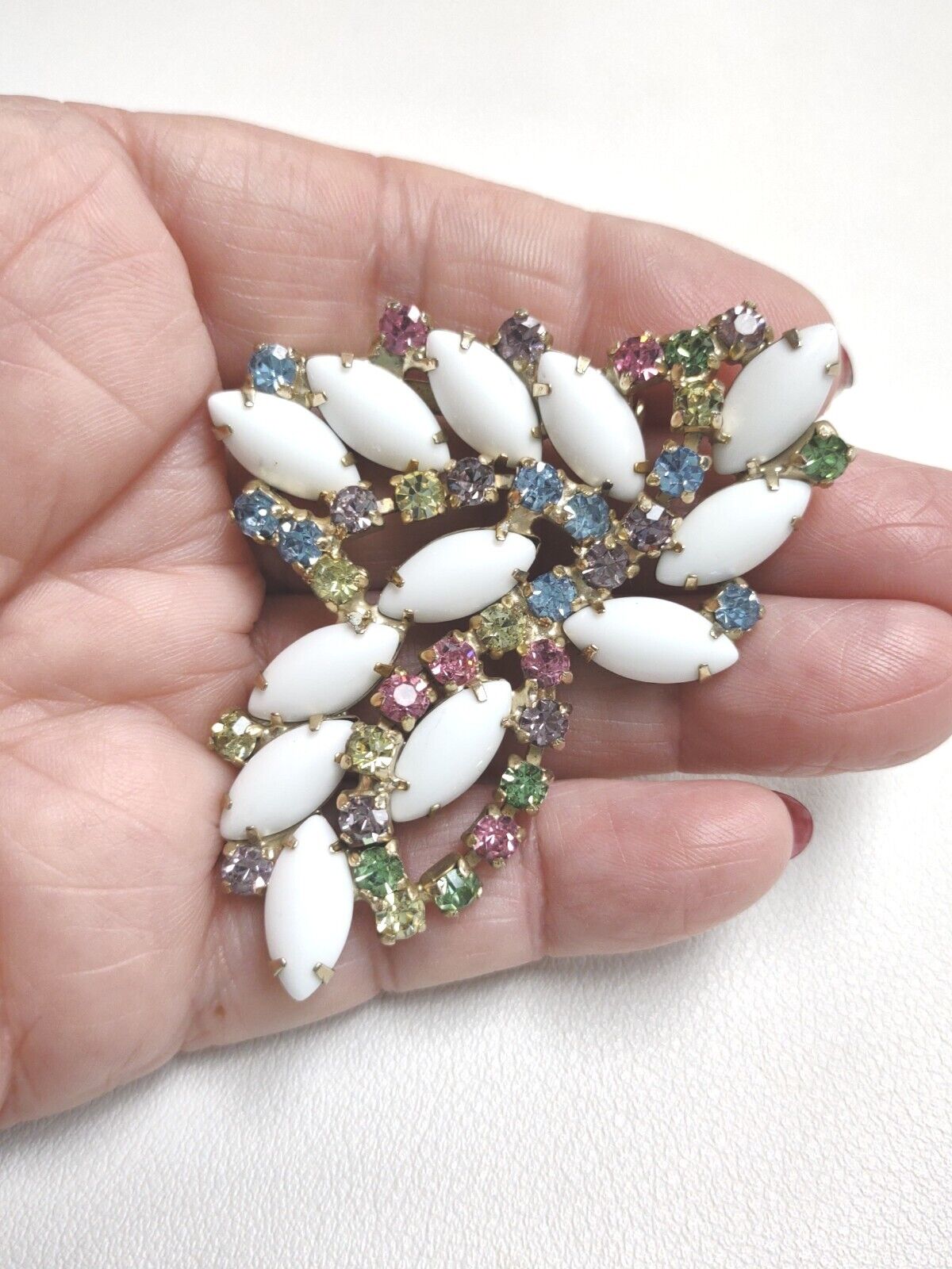 Title (ebay affiliate link): Vintage Gold Tone White Milk Glass Pastel Rhinestone Brooch Pin Jewelry D43