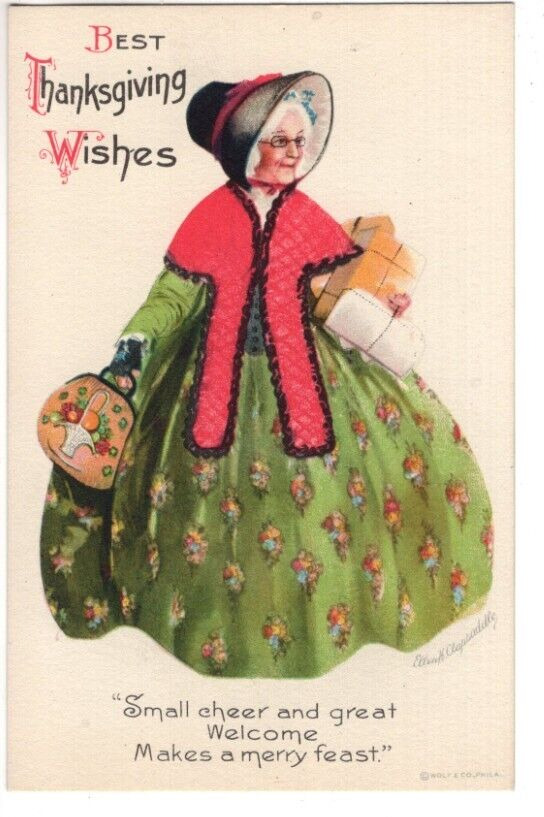ANTIQUE THANKSGIVING Postcard ELLEN CLAPSADDLE OLDER LADY GREEN PRINT DRESS