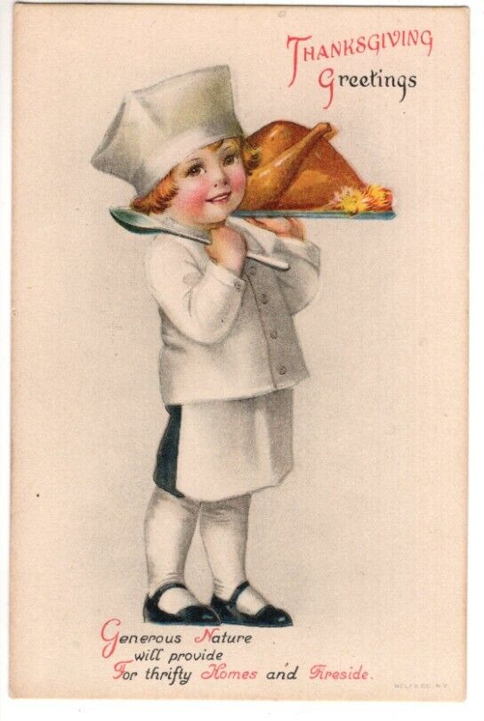 Title (ebay affiliate link): ANTIQUE THANKSGIVING Postcard YOUNG CHEF CARRYING TURKEY ON TRAY SPOON
