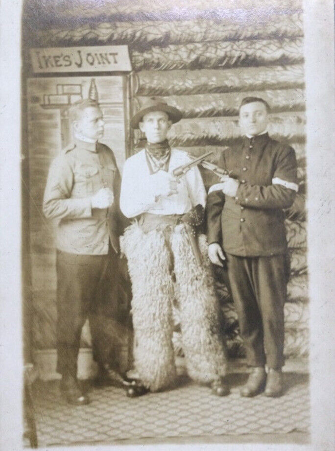 Title (ebay affiliate link): Antique Postcard WW1 Military Uniform Revolver Guns Furry Cowboy Chaps Bar RPPC