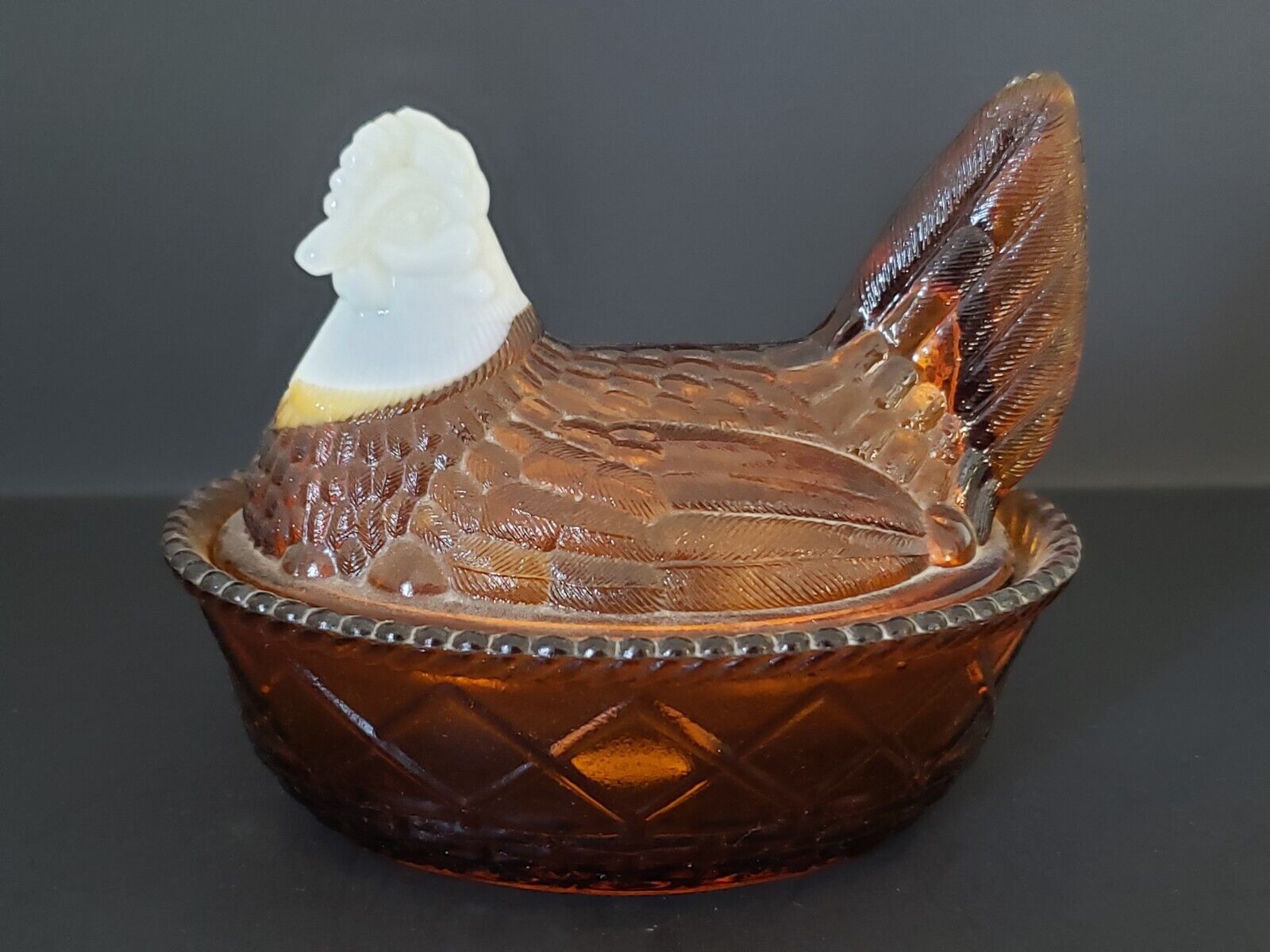 Title (ebay affiliate link): 166 Milk Glass Westmoreland Hen on Nest White head and amber body