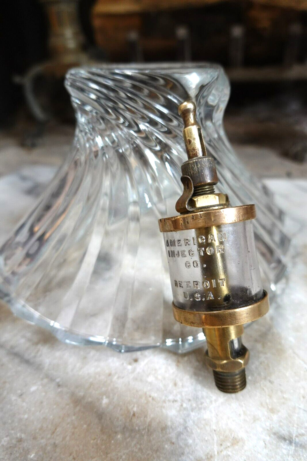 Antique AMERICAN INJECTOR BRASS OILER w/EMBOSSED GLASS Steam HitMissEngine
